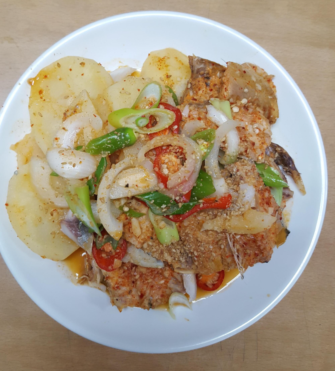 고등어 2마리 , 감자 1개 , 양파1/4 , 홍고추 1개 , 청고추1개 ,, 대파 조금, 마늘 2알 ,생강조금