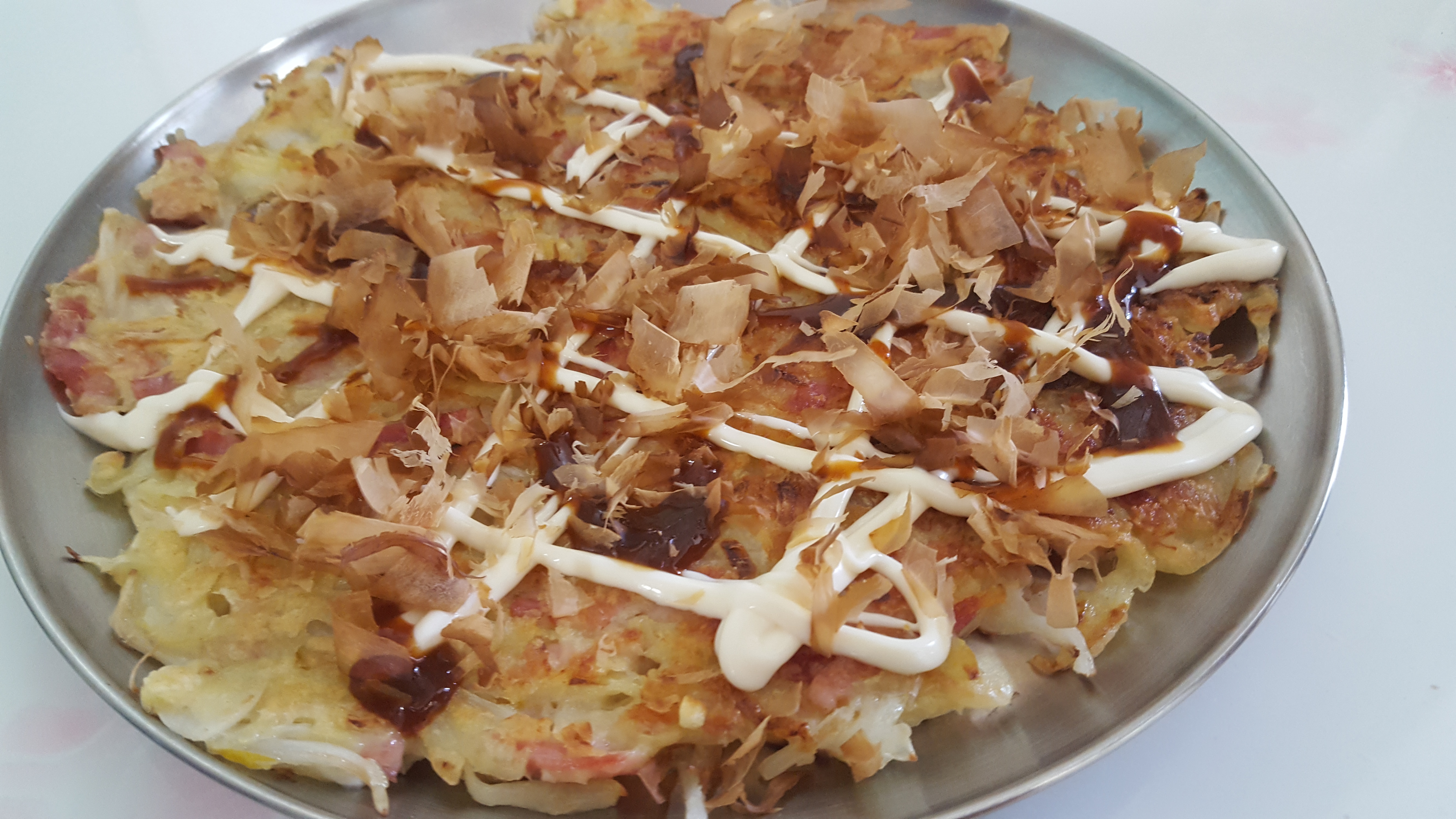 오꼬노미야기에 데리야끼와 마요네즈를 뿌리시고 가다랑어포를 뿌리시면